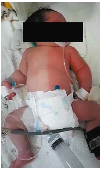 Newborn of a 34-year-old woman with type 2 obesity complicated by gestational diabetes and mild preeclampsia. Uncomplicated spontaneous vaginal birth at 37 weeks on June 6, 2020. Normal amniotic fluid, 3,785 grams, with an Apgar score of six and eight. At four hours, he experienced progressive respiratory distress with expiratory grunt and cyanosis, Silverman-Anderson (SA) score of four, which led to his admission to the intermediate care unit. The baby was started on intravenous (IV) fluid, antibiotic coverage with amikacin and ampicillin at the standard dose, and given oxygen.
