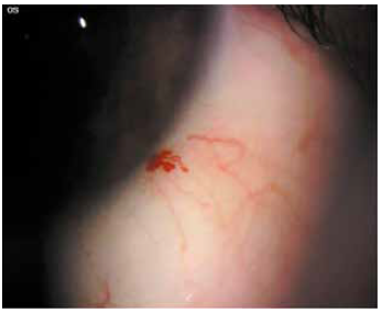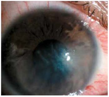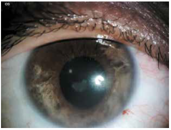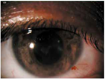 Se procede a la extracción del cuerpo extraño con previa protección antimicrobiana con antibiótico tobramicina, antiinflamatorio esteroideo prednisolona, gotas hipertónicas y un lubricante mixto carboximetilcelulosa y glicerina. A la semana, se observa la formación de una opacidad capsular anterior con signos de atrofia iridiana, la cual empieza a dar una apariencia de “cambio de color del iris”; a las dos semanas se evidencia la dilatación de la vasculatura periciliar a horas 4 en forma. Figura 4, y a las 4 semanas el paciente presenta una agudeza visual de 20/25 en ambos ojos, con transparencia corneal, persistencia de la atrofia iridiana. Figura 5 y catarata traumática capsular anterior, con remisión de sintomatología en el paciente.