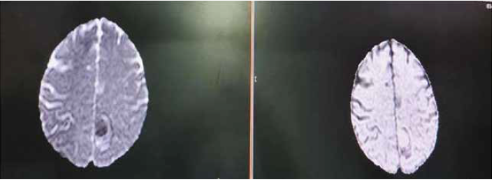 Paciente mujer de 44 años, natural de Ayacucho, procedente de Lima, con antecedente de Síndrome de Evans diagnosticado desde hace 30 años en tratamiento con corticoides. Acude con un tiempo de enfermedad de 3 días de inicio brusco y curso progresivo. Refiere presentar cefalea holocraneana a predominio frontoparietal izquierdo de moderada intensidad (EVA 6-7/10), que remite parcialmente con analgésicos orales. El cuadro se exacerba con náuseas y vómitos y posteriormente alteración del sensorio, siendo traída a emergencia realizándose Resonancia Magnética Cerebral.