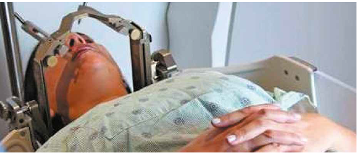 En dicho procedimiento se ubica un cavernoma a nivel parietal media posterior izquierdo con un volumen de 4,12 centímetros cúbicos. Se aplicó 16 Gy y 50 % utilizándose 15 disparos, los 11 primeros con colimador de 8 mm y los últimos 4 con colimador de 4mm. Paciente tolera el procedimiento.