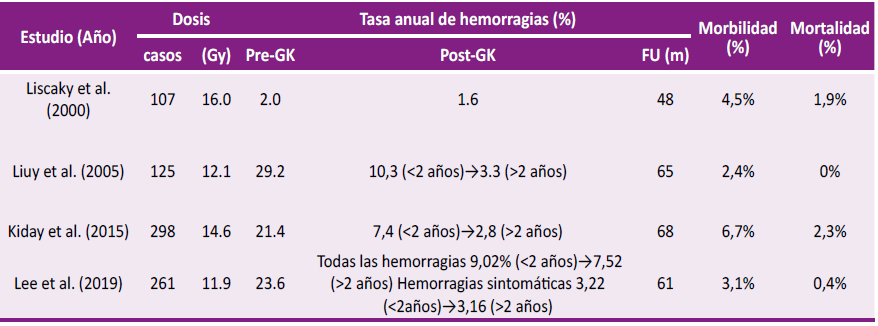 Hasta la fecha, se han realizado cuatro grandes estudios sobre el uso de gamma knife(>100 casos con al menos 4 años de seguimiento) específicamente para el tratamiento de malformaciones cavernosas cerebrales hemorrágicos o sintomáticos repetidos, que comprenden un total de 530 pacientes (Tabla 1)[13-16].