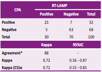 When comparing both tests (RT-LAMP and CPA) with a total of 100 samples, a concordance of 88.0% and a Kappa index of 0.72 (0.56 - 0.87) were obtained; when correcting the Kappa index for bias using the resampling technique by bootstrapping set to 1000 replicates, a 95%CI of 0.55 - 0.85 was obtained (Table 2). In the comparison of sensitivity and specificity between CPA and LAMP, McNemar’s chi-squared test for paired sample showed no statistical difference -0.02 (95%CI -0.09, 0.05, p=0.563).