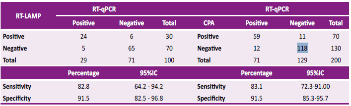 For the CPA method, a total of 71 positives and 129 negatives were used. It identified a total of 70 positives and 130 negatives. When compared with the results obtained by RT-qPCR, a sensitivity of 83.1% (95%CI 72.3 - 91.0%) and a specificity of 91.5% (95%CI 85.3 - 95.7%) were obtained, as shown in Table 2.