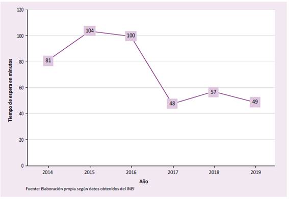 Según el Instituto Nacional de Estadística e Informática (INEI), en el 2015, el tiempo para la atención promedio, sea público o privado, hasta recibir atención en consultorio médico fue de 104 minutos, en caso de clínicas, fue de 42 minutos, en EsSalud fue de 81 minutos y los que mayor tiempo de espera registraron fueron los que acudieron a establecimientos del Minsa, con un aproximado de 148 minutos.[4] En el año2016, se reportó que en hospitales del ministerio y de gobiernos regionales fue aproximadamente 135 minutos y 100 minutos a nivel nacional.[5] Por el contrario, el tiempo de espera en los años 2017, 2018 y 2019 fue menor, llegando a ser en promedio 48 minutos, 57 minutos y 49 minutos, respectivamente. [5-8] (Figura 3). La duración de espera puede generar insatisfacción del usuario externo, aglomeración, disminución del distanciamiento social, aumento de probabilidad de contagio y afectar negativamente en la atención. [6-9]