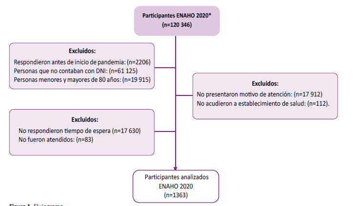 Para el análisis secundario, se incluyó a los encuestados mayores de 18 años que cuentan con Documento Nacional de Identidad (DNI), quienes antes de cuatro semanas de la aplicación de la encuesta acudieron a algún establecimiento de salud del MINSA o EsSalud. Se excluyeron a 2206 encuestados que respondieron durante los meses de enero y febrero, 61 125 entrevistados por no contar con DNI, 19 915 entrevistados menores de 18 y mayores de 80 años. Se excluyeron a 17 912 entrevistados que acudieron por presentar accidente como motivo de consulta, 112 que no acudieron a establecimiento de salud MINSA o EsSalud, se excluyeron 17 713 encuestados que no contaban con información completa. (Figura 1) Por lo cual el análisis final fue de 1363 pacientes (Figura 1).