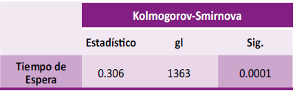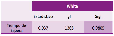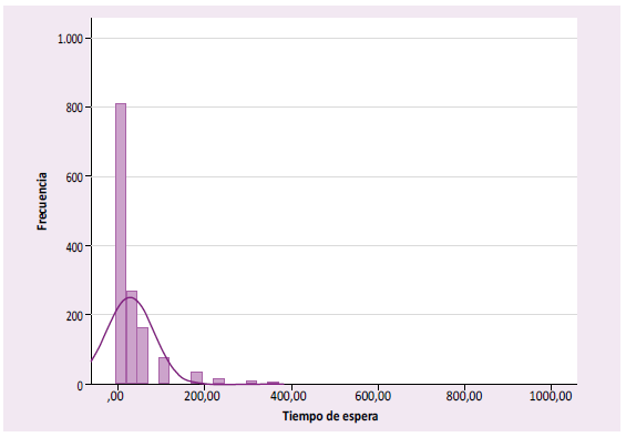 Respecto a test de Kolmogorov- Smirnov, como el nivel de significancia asintótica bilateral obtenido (0.000) fue menor al nivel de significancia (a=0.05=5 %), entonces se rechaza H0 y se acepta H1, es decir, se acepta que la distribución de la variable tiempo de espera no proviene de la distribución normal, por lo que en la prueba de hipótesis se debe utilizar una prueba no paramétrica. (Tabla 1) De igual manera, se obtuvo que el gráfico del histograma presentó una distribución no normal. (Figura 2) Sin embargo, al contar con 1363 participantes analizados, se utilizó el teorema del límite central, en el cual se indica que si hay una muestra aleatoria de población suficientemente grande (>30 participantes), la distribución de las medias muestrales se puede aproximar a una distribución normal. Por tanto, al tener un tamaño de muestra de 1363 participantes, se puede usar tests paramétricos incluso si la distribución de la población subyacente no es normal.[11] En caso del test de White se obtuvo que el valor fue mayor al nivel de significancia, por lo cual se acepta la H0, es decir, que existe homocedasticidad. (Tabla 2)