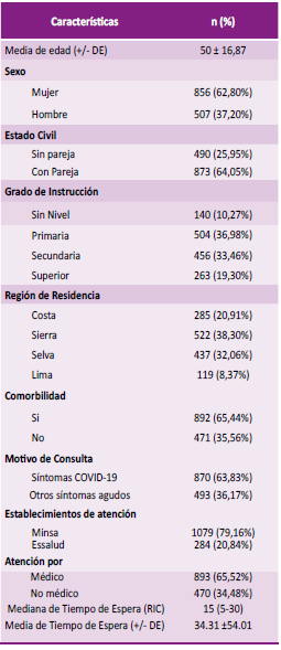 Se realizó el análisis de 1363 personas encuestadas. La edad media fue de 49.16 años y el género predominante fue el masculino (62,80 %). La mayoría de las personas encuestadas registraron contar con pareja (64,05 %). El grado de instrucción que predominó fue primaria (36,98 %). La mayor parte de los participantes fueron encuestados en la sierra (38,30 %). Se presentó una prevalencia de comorbilidades de 65,44 %. El motivo principal de atención fue por sintomatología COVID-19 (63,83 %), la mayor parte de los pacientes acudieron a establecimientos de salud MINSA (79,16 %) y la mayoría fue atendido por personal médico (65,52 %). La mediana de tiempo de espera fue de 15 minutos (Tabla 3).