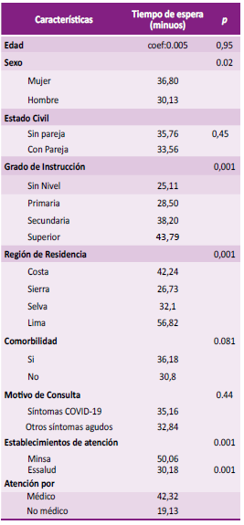 En el análisis bivariado se encontró asociación significativa entre mayor tiempo de espera con: sexo femenino (36,80 minutos), grado de instrucción superior (43,79 minutos), región de residencia en Lima (56,82 minutos), acudir a establecimiento de MINSA (50,06 minutos) y ser atendido por personal médico (42,32 minutos). No se obtuvo asociación significativa entre motivo de consulta y tiempo de espera (Tabla 4).