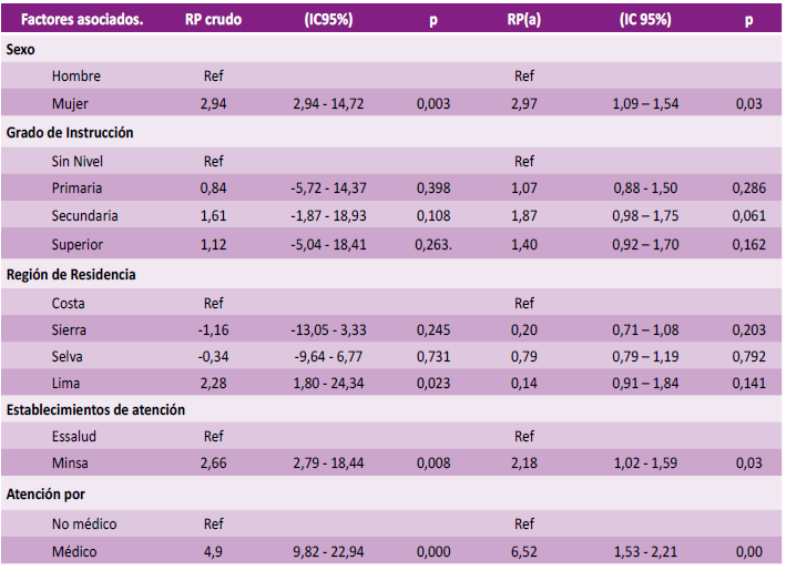 En el modelo de regresión multivariado ajustado, las variables asociadas significativamente a mayor tiempo de espera fueron sexo femenino (RP: 2,97; IC: 1,09 - 1,54), acudir a establecimiento de MINSA (RP:2,18; CI: 1,02 - 1,59) y ser atendido por personal médico (RP: 6,52; IC: 1,53 - 2,21) (Tabla 5).