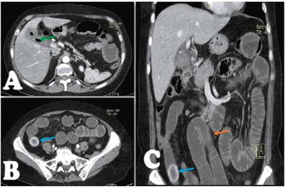 Presentamos el caso de una paciente femenina de 59 años, con antecedente de hipertensión arterial mal controlada, que acude por presentar 72 horas antes de su ingreso, dolor abdominal cólico, a predominio de mesogastrio, distención abdominal, náuseas y vómitos, y falta de eliminación de heces y flatos. A su ingreso por emergencia se encontró hemodinámicamente estable, al examen físico una tumoración umbilical irreductible dolorosa y un abdomen distendido, doloroso difusamente, sin signos peritoneales, ruidos hidroaéreos alejados. La analítica mostró leucocitosis sin desviación izquierda, hemoglobina 13,7gr/dl, glucosa 219mg/dl, PCR 25mg/L, hiperlipidemia mixta, procalcitonina negativa y resto de exámenes dentro de parámetros normales. Los rayos X de abdomen evidenciaron asas delgadas dilatadas sin presencia de niveles hidroaéreos, y la ecografía informó una masa hepática heterogénea con imágenes hiperecogénicas en su interior de bordes mal definidos, no líquido libre. La tomografía abdominal con contastre reveló distención de asa delgada, llena de líquido, con niveles hidroaéreos, una imagen hiperintensa a nivel de íleon distal y vesícula con presencia de aerobilia (Figura 1).