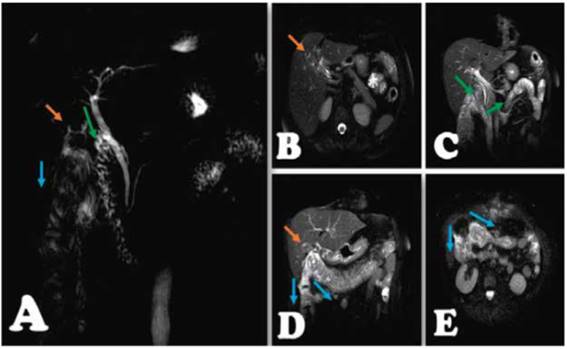 Paciente presenta mayor dolor, distención y alteración del medio interno, por lo que es intervenida por cuadro de obstrucción intestinal. En la cirugía se evidencia espacio subhepático bloqueado por epiplón firmemente, líquido libre serohemático, asas delgadas distendidas sin presencia de sufrimiento intestinal, así como a 20 cm de válvula ileocecal, cálculo de 3cm ocluyendo la luz intestinal; por las comorbilidades, y cuadro quirúrgico de emergencia, se decide realizar una cirugía en dos tiempos: primero, enterotomía a 20 cm proximales a la obstrucción, extracción del cálculo y enterorrafia transversal en dos planos con vicryl 3/0 (Figura 2). Posteriormente, se realiza una endoscopía que evidencia orificio de 7mm en primera porción duodenal, pero sin salida de contenido biliar, sugerente de fístula colecisto duodenal y una colangioresonancia (Figura 3), para programar su segunda intervención. Paciente presenta buena evolución clínica y es dada de alta sin complicaciones con la indicación de regresar en dos meses para la colecistectomía y cierre de FBD.