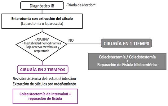 Por lo tanto, cada conducta quirúrgica se debe indicar según el estado clínico del paciente y condiciones preexistentes [1,6,8](Figura 4). En los casos en que el paciente esté hemodinámicamente inestable, sea mayor de 70 años, tenga baja reserva respiratoria, estado ASA III o IV o cualquier otro signo de gravedad, podemos utilizar inicialmente la cirugía urgente (Enterolitotomía) [19]. La enterolitotomía con colecistectomía y reparación de fístula diferidas(4-24 semanas) [8,11], tiene menor mortalidad (11,7 vs 16,9 %), en comparación con la cirugía en un solo tiempo [1,3,8,13], sin embargo, presenta hasta un 5 % de recidiva [1,6–8], que generalmente se presenta durante los primeros 6 meses posteriores a la operación inicial [15]. Por lo que estaría indicada, en pacientes inestables y con alto riesgo quirúrgico [1,2,7,8,11].