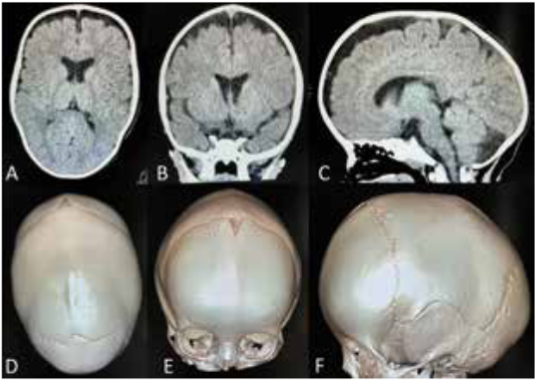 Varón de 1 año, con peso de 10,5kg y talla de 72cm. Ingresa por consultorio de pediatría, refiriendo desde nacimiento un crecimiento anteroposterior anormal del cráneo. Al examen físico: despierto, activo, cráneo dolicocéfalo sin sutura sagital, estrecho, alargado y con índice cefálico disminuido, moviliza cuatro extremidades; ojos, nariz y boca de características normales. Tomografía computarizada cerebral sin contraste: sinostosis sagital (FIGURA 1).