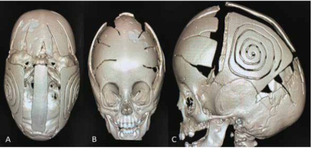 Se realiza planificación quirúrgica con impresión digital 3d con modelo personalizado a escala real. Cirugía: craniectomías lineales para sagital, coronal y lambdoidea bilateral más osteotomías en espiral témporo-parietal bilateral, y osteotomías a nivel frontal y occipital en cuña. (FIGURA 3)