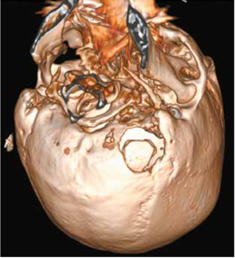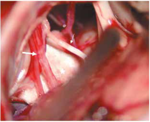 Se decide realizar una incisión curvilínea vertical, aproximadamente a 3cm del borde posterior del pabellón auricular, se diseca por planos, luego se procede a realizar una craneotomía suboccipital lateral retromastoidea izquierda (Imagen N° 2), se apertura duramadre en “Y” invertida, después se procede a realizar un abordaje cerebeloso infralateral izquierdo, disección de aracnoides, hasta encontrar los pares craneales bajos, donde se logra evidenciar la compresión neurovascular del loop proximal de la PICA izquierda con el IX PC izquierdo, además de una dolicobasilar que generaba que la arteria vertebral izquierda estuviera más lateralizada de lo habitual (Imagen N° 3 y 4).