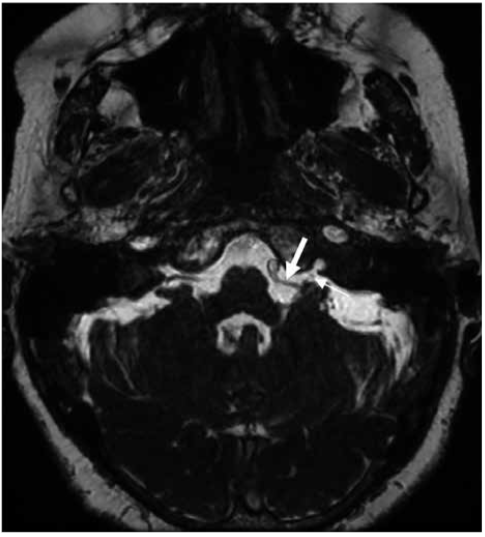 Se le realiza una resonancia (RMN) cerebral contrastada más secuencia FIESTA (fast imaging employing steady-state adquisition) donde no se observan tumoraciones o captaciones anómalas de contraste, pero se logra identificar una compresión neurovascular entre el loop proximal de la arteria cerebelosa posterio inferior (PICA) izquierda y el IX PC izquierdo (Imagen N° 1). Es por ello que se decide manejo quirúrgico debido a la comprobación imagenológica del conflicto y la refractariedad al manejo médico conservador.
