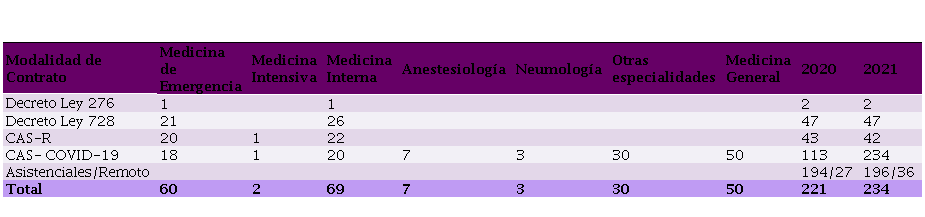 Gestión de Recurso Humanos: El reto de la gestión de recursos humanos está encaminada a mantener y retener al personal sumamente comprometido y altamente capacitado [8], además de perseguir un direccionamiento estratégico [9] para cumplir los objetivos generales de la pandemia COVID-19 (contribuir a la disminución del impacto de morbimortalidad), a través de capacitaciones intramurales y extramurales, sumándose la seguridad individual de cada profesional de la salud, algunos de ellos se acogieron a la licencia de aislamiento social voluntario por el COVID-19 [10], 40 médicos aceptaron, voluntariamente, las disposiciones del gobierno. Iniciamos las atenciones a pacientes COVID-19 en la primera ola 2020 con 221 médicos; y en la segunda ola del 2021 con 234 médicos, de los cuales 194/196 médicos estaban en actividad asistencial, respectivamente (27.2 % emergencistas, 31.2 % médicos internistas, 22.6 % médicos generales, 13.6 % otras especialidades, 3,2 % anestesiólogos y 1.4 % neumólogos) y 27 en actividad remota (Tabla 01). Según la recomendación de la OPS, se establecieron dos tipos de ingreso a la unidad; cama tipo A (paciente crítico inestable) y cama tipo B (paciente crítico estable) con una ratio cama-médico 1 médico intensivista por 6 camas; o 12 camas por 01 médico intensivista y 01 médico especialista (internista, emergenciólogo, infectólogo).