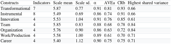 Discriminant validity was assessed as suggested by Fornell and Larcker (1981). The AVE for each of the two leadership constructs and the five individual performance sub-constructs was compared to the highest variance shared by each factor with all other factors in the model. These results are provided in Table I. As it can be seen, the sub-constructs for team, organization and production did not present satisfactory discriminant validity. It would be necessary to group all indicators into a single sub-construct to obtain the desired discriminant validity, but this would entail a conceptual change in the original scale. Therefore, despite not verifying the discriminant validity for these three dimensions, we preferred to keep them in their original format and recognize this as one of the study’s limitations.