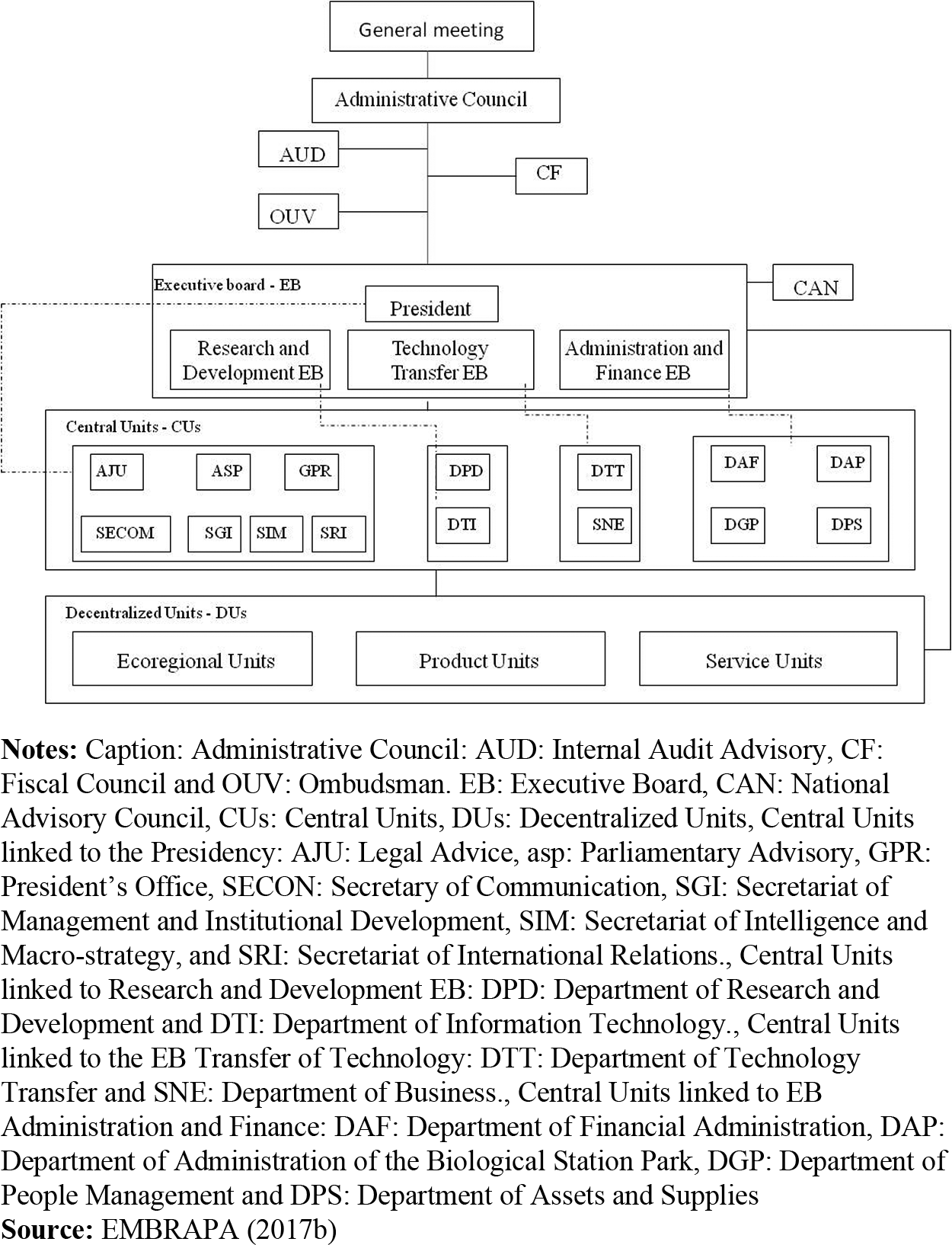The organizational structure of EMBRAPA involves units such as auditing, ombudsman, fiscal council and board of directors. Based on this, the top management consists of president and three executive officers (Administration and Finance, R&D and Technology Transfer). Top management and the Central Units (CU) are located at the headquarters in Brasília, and the CUs are linked to the top management, either to the President or to the executive directors. They support the other DUs, which are also linked to top management and are classified as ecoregional, product and service units. In Figure 1, we can visualize the EMBRAPA organization chart.