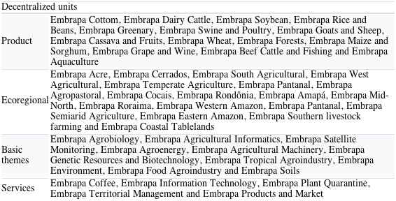The organizational structure of EMBRAPA involves management, secretariats, departments, committees with emphasis on the various Units dispersed nationally and internationally (presented in the item internationalization). EMBRAPA has, in national territory, 17 Central Units (CUs) and 46 Decentralized Units (DUs) (Table II). The DUs are classified according to the area of activity: of products (14 DUs), eco-regional (17 DUs), basic themes (10 DUs) and services (5 DUs). Table II shows some DUs according to their categories.