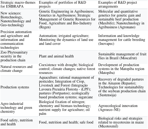 To reduce redundancies and improve coordination (efforts and skills), EMBRAPA recently started to use two configurations to group the R&D projects: portfolios and arrangements. The portfolios carry out managerial support for the management of related projects, according to thematic view. The themes are strategically defined and have a corporate character (Table III) (EMBRAPA, 2017d). In other words, the portfolios agglutinate projects linked to a certain area. The portfolios follow the top-down strategy, that is, they intend to direct the results to be achieved in certain themes, which are strategic for the organization. Because it is a public research company, it has some demands that are fulfilled by the portfolios, as can be observed in the interviewee’s report: