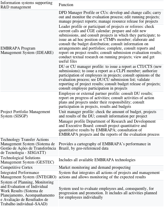 Finally, we should add that information systems support R&D management in EMBRAPA, including national and international initiatives, with the main ones being synthesized in Table V.