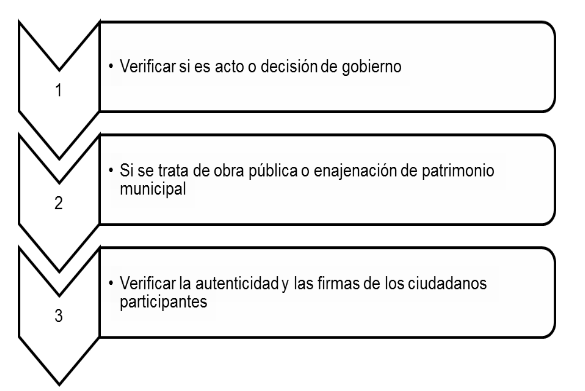 Fuente: elaboración propia.Conforme al procedimiento descrito, primero se analizó si se trataba de una decisión de gobierno. Se conoció que 4 de 7 votaron en sentido positivo, pero 3 lo hicieron en sentido negativo, considerando que no hay desincorporación de bienes de dominio público. Con el voto negativo de los tres consejeros mencionados no se alcanzó mayoría calificada por lo que se declara improcedente el plebiscito.