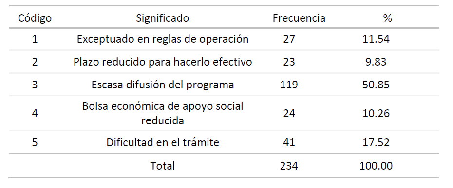 De la muestra, el 50.85% de los informantes coinciden que el programa es poco conocido por la población, entre otras situaciones; conviene la atención de los evaluadores de los programas sociales de Gobierno para que estos cumplan su cometido, el 17.52% aduce que el trámite es burocrático y solo un 11.54% manifiesta como debilidad ser excluido por las reglas de operación.