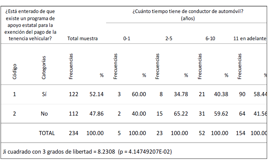Para Triola (2000) la contingencia se refiere a dependencia, pero solo desde el punto de vista estadístico, sin un vínculo directo de causa y efecto entre las variables, por tal razón el tiempo de poseer un automóvil 11 años o más representado por el 65.81%, debiera ser condición para que el contribuyente esté enterado de que existe un programa de apoyo al pago de la tenencia vehicular; sin embargo, el 47.86 % lo desconoce, es decir poco menos de la mitad de la muestra desconoce el programa, aun cuando la mayor parte son propietarios por largos periodos de tiempo (Tabla 6).