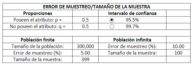 Para calcular el tamaño de la muestra se utiliza la herramienta DYANE, considerando que por encima de 300 mil casos, resulta el mismo valor para cualquier tamaño del universo; se define el error estándar del 5%, que es el máximo tolerable de que la muestra no sea representativa de la población, alto por los diferentes estratos sociales en el Estado, además Hernández y otros (2010) sugieren que en ciencias sociales es el valor recomendado; por último, el nivel de confianza es de 95% como complemento al error máximo aceptable del 5% (ver Figura 1).