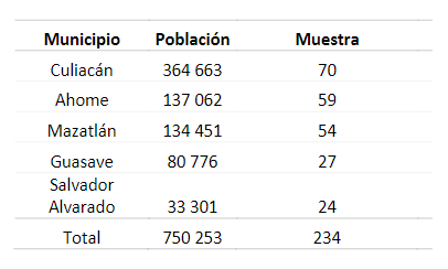 Los municipios de Culiacán, Ahome, Mazatlán, Guasave y Salvador Alvarado concentran el 81% de total de vehículos en circulación, por lo que se aplican 234 cuestionarios en 5 municipios de los 18 que componen el estado de Sinaloa (Tabla 1).