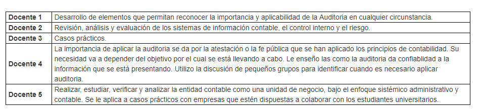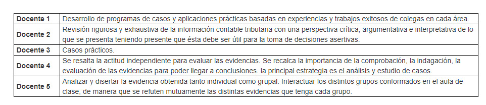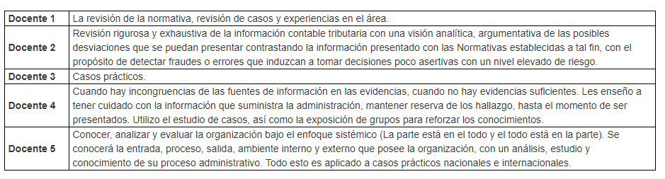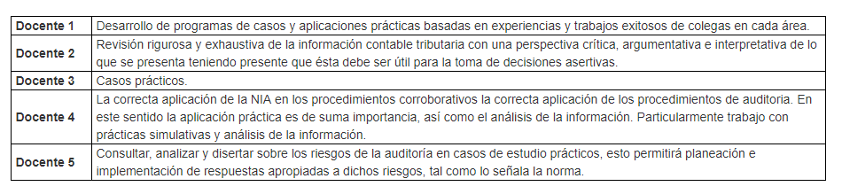 Adicionalmente, los docentes indicaron que aplican estrategias como el desarrollo de programas de casos y estudios prácticos, la revisión rigurosa y exhaustiva de la información contable tributaria con una perspectiva crítica, argumentativa e interpretativa considerando que ésta debe ser útil para la toma de decisiones asertivas, así mismo, el análisis de la información con respecto a la correcta aplicación de la NIA en los procedimientos corroborativos y procedimientos de auditoría, estudio de casos prácticos que consistan en consultar, analizar y disertar sobre los riesgos de la auditoría, a fin de permitir la planeación e implementación de respuestas apropiadas a dichos riesgos.