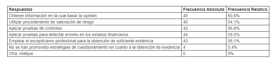 Ahora bien, dado que algunos estudiantes indicaron en un mínimo porcentaje que no se están aplicando estrategias para la obtención de evidencia, y considerando que un número importante de ellos no opinó al respecto, es fundamental en la función docente con base en los postulados teóricos del Public Company Accounting Oversight Board (2012) la profundización en el estímulo de esta herramienta para promover el escepticismo profesional, tomando en cuenta su requerimiento en el campo laboral y las competencias que aporta al auditor para desarrollar una mentalidad inquisitiva en su actividad profesional independiente.