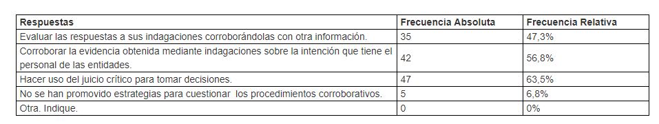 Por su parte, en lo referente a la aplicación de estrategias tendientes a procedimientos corroborativos los estudiantes, mostraron que durante su proceso de formación universitaria los docentes les han proporcionado estrategias útiles para el implemento de los mismos sobre la información contable, entre las señalan, el uso del juicio crítico para tomar decisiones, corroborar la evidencia obtenida mediante indagaciones sobre la intención que tiene el personal de las entidades y evaluar las respuestas a sus indagaciones corroborándolas con otra información.