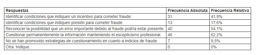 En referencia a las opiniones presentadas por los estudiantes, estos señalaron que los docentes le han promovido estrategias para reconocer los indicios de fraude, sobresaliendo entre ellas, el cuestionamiento permanente de la información, el reconocer la posibilidad de que un error importante debido a fraude podría estar presente y la identificación de condiciones que indiquen un incentivo para cometerlo, así pues, los docentes indicaron que emplean la revisión de la normativa, examen de casos y experiencias en el área, la investigación rigurosa y exhaustiva de la información contable y la aplicación de casos prácticos.