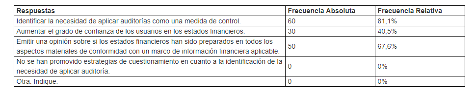 Estos resultados evidencian una fortaleza para el desempeño laboral del futuro profesional contable puesto que le permitirá identificar cuándo se debe realizar una auditoría a los estados financieros, así como, el momento en que es requerido expresar una opinión sobre la razonabilidad de la información contable y el cumplimiento de las normas relativas a ello.