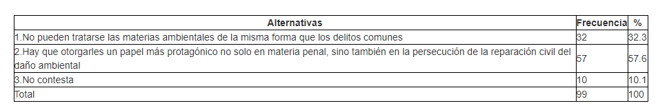 Como se observa en la Tabla 1, los encuestados manifestaron en un 57.6% que a las y los fiscales debe otorgárseles un papel más protagónico en la defensa del derecho a vivir en un ambiente sano, porque de conformidad al inciso 2° del Art. 10 de la Constitución de la República de Ecuador (Asamblea Constituyente, 2008) a la naturaleza se la considera un sujeto de derechos y resulta inconveniente que sean los particulares los que deban interponer acciones para su protección, ya que de conformidad al inciso final del Art. 400 del mismo cuerpo constitucional, se declara de interés público la conservación de la biodiversidad y todos sus componentes, razón por la cual para proteger este interés deberían otorgarse facultades especiales a las y los fiscales en esta materia, cosa que ocurre en el derecho comparado.