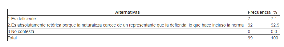De acuerdo con la Tabla 2, los entrevistados manifestaron en un 7.1% que se trata de una norma deficiente y un 92.93% optó por señalar que esta norma es absolutamente retórica porque la naturaleza carecede un representante que la defienda, lo que hace ilusoria la misma, razón por la cual existe acuerdo en los encuestados de tener una percepción negativa acerca de la eficacia de esta normativa.