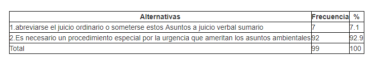 Los entrevistados manifestaron en un 94.9% que por la urgencia de las materias ambientales, las indemnizaciones no deben someterse a dilatados procesos civiles ordinarios, solo un 5.1% declaró que el procedimiento ordinario es adecuado. La pregunta se responde por sí sola porque debido a la urgencia de las materias ambientales, es necesario un procedimiento sumario para cobrar las indemnizaciones que correspondan.