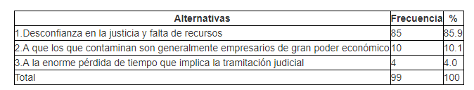 Como se observa en la Tabla 7, los encuestados seleccionaron diversas opciones que dejaron en evidencia las razones por las cuales los particulares no interponen denuncias ambientales: 85.9% de ellos manifestó tener desconfianza en la justicia y falta de recursos; 10.1% señaló que quienes contaminan son generalmente empresarios de gran poder económico contra los cuales es difícil debatir y, finalmente, 4% respondió que los particulares no denuncian debido a la enorme pérdida de tiempo que implica la tramitación judicial.