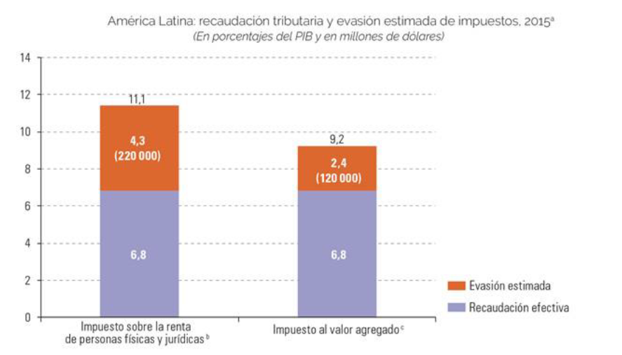 CEPAL (2016). Los principales incumplimientos tributarios se dan en el impuesto sobre la renta. América Latina: Recaudación tributaria y evasión estimada de impuestos 2015, en porcentajes del PIB y millones de dólares. Extraído de: https://www.cepal.org/es/noticias/evasion-fiscal-america-latina-llega-340000-millones-dolares-representa-67-pib-regional consulta 10/05/2018.