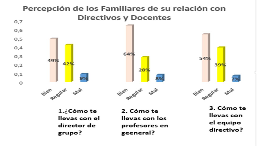 54% de los encuestados dice llevárselas bien con los directivos y docentes, pues ninguno manifestó malestar con alguno de los miembros del equipo directivo. Asimismo, es evidente que las familias se las llevan bien con los docentes representados en un 64% y dicen llevárselas bien con el director de grupo un 49%. Esta información, da cuenta de un aspecto positivo de la convivencia puesto que, del comportamiento y actitudes de los padres depende en gran manera las relaciones de comunicación e interacción entre la escuela, los estudiantes y su familia (Palma y Álvarez, 2009).