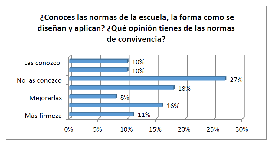 Por otro lado, el 27% de las familias encuestadas desconocen las normas establecidas en la escuela; un 18% de ellos afirman que estas normas no se respetan y un 16% opina que no se aplican. Sin embargo, existe un 20% que las conoce y las considera buenas; mientras que un 11% revela la necesidad de mayor firmeza en su aplicación y una minoría representada en el 8% declara la necesidad de mejorarlas (ver gráfico 2.). Como se puede observar son innegables las discrepancias existentes en la percepción de la convivencia por parte de los representantes de las familias de la institución.