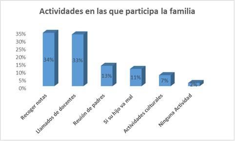 Estos datos se corresponden con la preocupación del Estado colombiano respecto a la poca participación del padre o acudiente en la relación con la escuela como educadora. Ante ello, aducen el no tener tiempo para vincularse en actividades escolares por los compromisos domésticos y labores externas que realizan. De tal modo, cuando son citados a la escuela, se acercan enojados pues, según ellos, los hacen perder el tiempo, si ésta no corresponde con la entrega de informe académico. Tal situación, requiere mejora desde la implementación de estrategias que vinculen a la familia de forma más directa a la escuela. Es decir, donde la familia se sienta importante en el proceso educativo y no sea ajeno a sus quereres y saberes la dinámica desarrollada al interior de la misma.