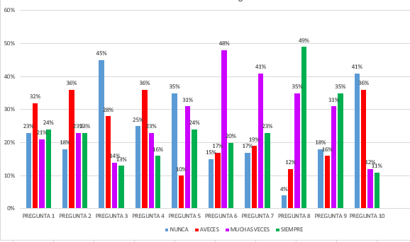 En concordancia con el respeto y cumplimiento de las normas (pregunta 8), los entrevistados muestran diversas percepciones, la más predominante se ubica en siempre 49% y 35% muchas veces y en a veces y nunca el resto de entrevistados un 16%. Para estos padres o acudientes, el hecho de que las normas no se cumplan es una situación alarmante y ponen de manifiesto las diferencias en cuanto al respeto de las mismas en la época en que ellos fueron escolares. En este punto es importante considerar la diferencia en la interpretación del cumplimiento de normas. Cabe resaltar, que el enfoque educativo de competencias básicas en Colombia exige un cambio en el desempeño de los estudiantes Martín y Puig (2007) exponen que “aprender a vivir de forma democrática sólo se puede conseguir viviendo democráticamente” (p.91). Por tanto, la escuela está convocada a promover acciones que constituyan relaciones más amigables para la convivencia.