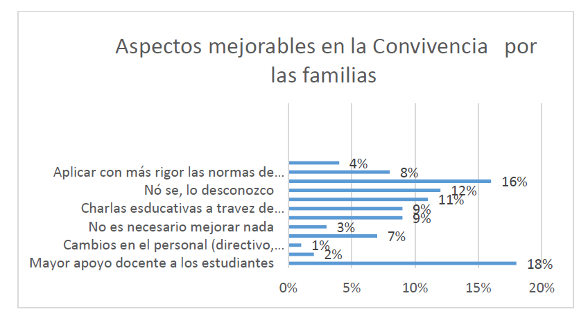 Las familias sugieren la necesidad de implementar una estrategia de mejoramiento integral de la convivencia que fortalezca las competencias ciudadanas en los estudiantes, para garantizar de esta forma la calidad en la convivencia escolar institucional.