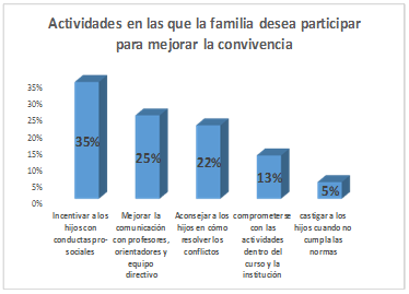Dentro de ellas se encuentran principalmente incentivar a los hijos con conductas pro-sociales en un 35%, mejorar la comunicación con profesores, orientadores y equipo directivo un 25%, aconsejar a los hijos en cómo resolver los conflictos un 22%, comprometerse con las actividades dentro del curso y la institución un 13% y castigar a los hijos cuando no cumpla las normas un 5%. Estas actividades propuestas se constituyen en base para generar estrategias de mejoramiento para la convivencia escolar.