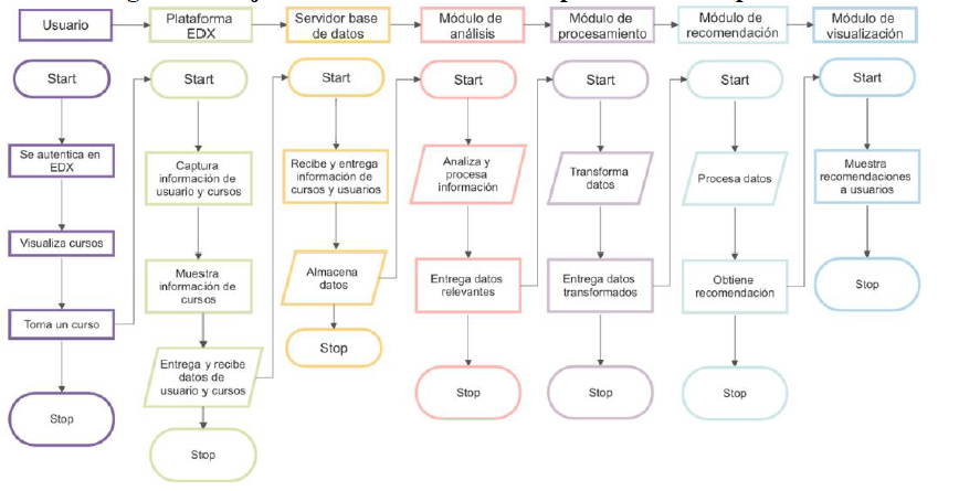 En ese sentido, un usuario ingresa a la plataforma EDX donde puede visualizar la información de los cursos y formarse en alguno de ellos. Toda la información proporcionada por el usuario: su registro, inscripción en cursos, y el avance de aprendizaje en cada uno de ellos es almacenado en las bases de datos que se encuentran dentro del servidor de bases de datos. Finalmente, los datos almacenados son analizados y procesados por cada uno de los siguientes módulos para finalmente obtener una recomendación apropiada para el usuario y que este pueda visualizarla. Ahora bien, el flujo del funcionamiento de toda la plataforma se visualiza en la Figura 3, seguido a esto se explica cada uno de los módulos en más detalle.