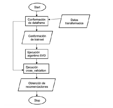 Después de obtener los datos y conformar el dataframe, se crea adicional un conjunto de datos llamados trainset que será el conjunto de datos utilizado para entrenar el modelo de recomendación y hacerlo cada vez más preciso. Para ello se utiliza la técnica llamada factorización de matrices (Galarza Hernández, 2017), la cual se realizó implementando el algoritmo SVD (Descomposición en valores singulares).