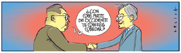 En el primer grupo de argumentos, se destacan las notas 11.1; 11.2 13.1, y 25.1, que recalcan la actitud extorsiva y disuasiva de Corea del Norte ahora que tiene capacidad nuclear para destruir cualquier capital del mundo, y la desconfianza que eso genera en Estados Unidos y Corea del Sur, país que, según el medio (13.1), habría hecho menos propaganda sobre la cumbre que su contraparte del norte. En el mismo sentido, Clarín publicó el siguiente cómic un día después de la cumbre.